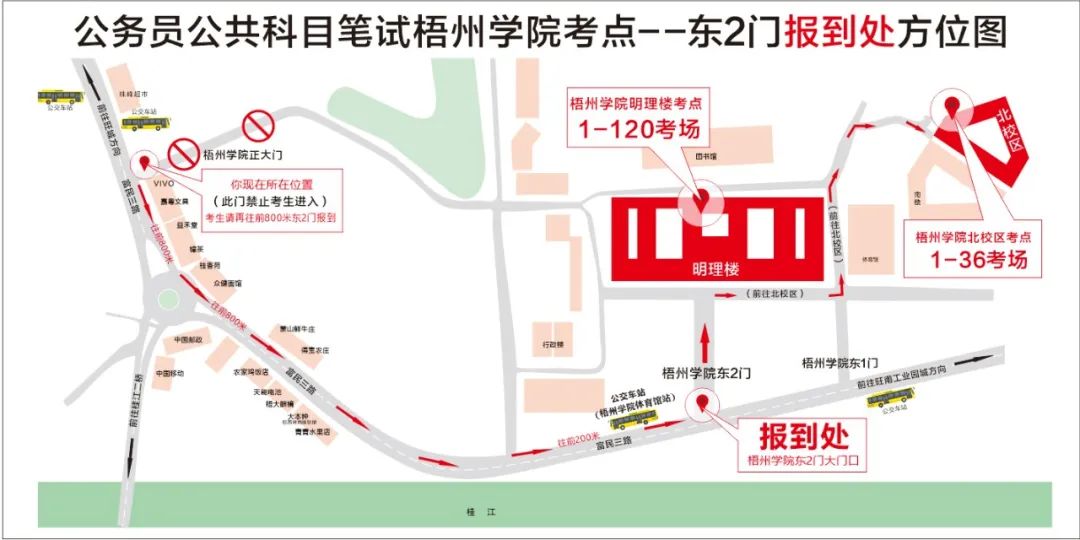 公交車參考:乘坐10路、32路、49路、49路延長線、蒼梧城鄉(xiāng)6路到梧州學(xué)院體育館站,下車后步行約200米到達(dá)梧州學(xué)院東大門??忌y(tǒng)一在梧州學(xué)院東大門進(jìn)入,考點門口處于交通干道,送考車輛只能在東門外短暫停留,梧州學(xué)院南門及其他門無法核驗考生身份。從東大門進(jìn)入明理教學(xué)樓考點考場步行約5分鐘,進(jìn)入北校區(qū)教學(xué)樓考點考場步行約15分鐘,請規(guī)劃好進(jìn)入考點時間。