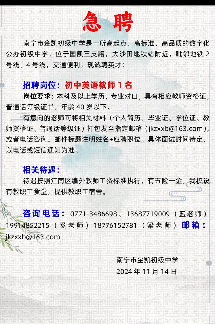 2024年南寧市金凱初級中學(xué)招聘英語教師1人