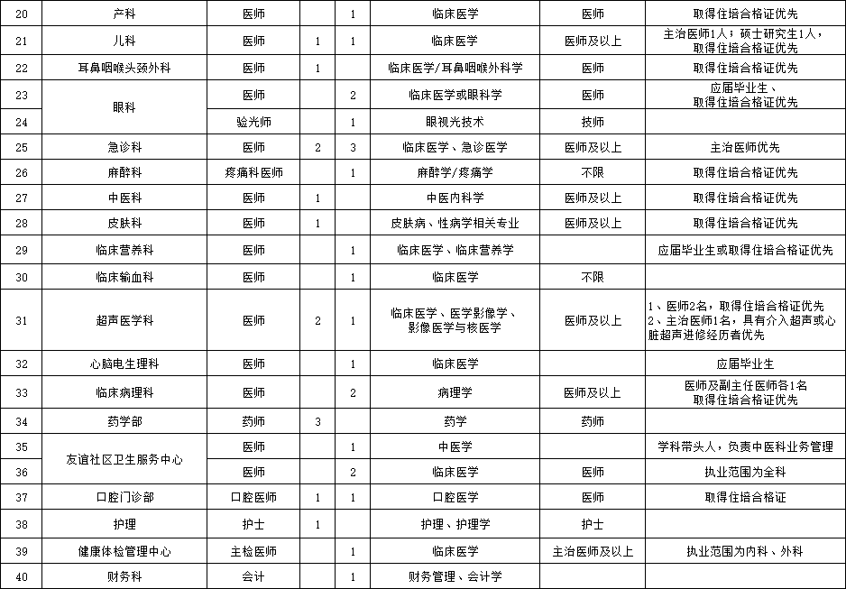 (五)應(yīng)聘人員除具備以上基本條件外,還應(yīng)符合招聘崗位所要求的資格條件;醫(yī)院緊缺專業(yè)((緊缺急需專業(yè):重癥醫(yī)學(xué)科、全科醫(yī)學(xué)科、康復(fù)醫(yī)學(xué)科、感染性疾病科、急診科、兒科、麻醉科、眼科、皮膚科、病理科、心腦電生理科等)人才可適當(dāng)放寬條件。
