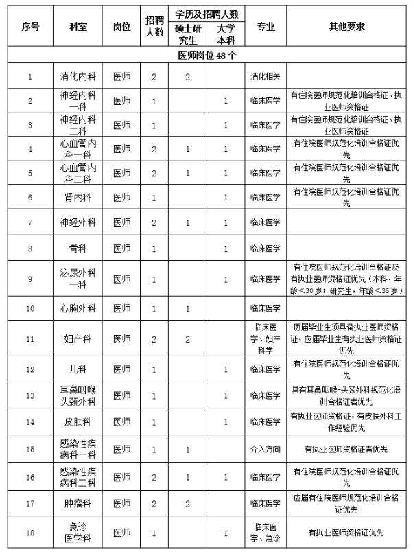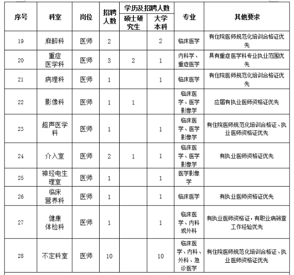 1.思想政治素質(zhì)好,擁護黨的路線、方針、政策。2.遵紀守法,醫(yī)德品行良好,有較強的事業(yè)心、責任心和進取心。3.身體健康,能滿足應(yīng)聘崗位需要。4.具備相應(yīng)的學歷和學位,有履行應(yīng)聘崗位職責的專業(yè)能力、技能條件。5.具有團隊精神,有良好的溝通能力。6.具備應(yīng)聘崗位所需要的其他條件。7.服從單位安排。