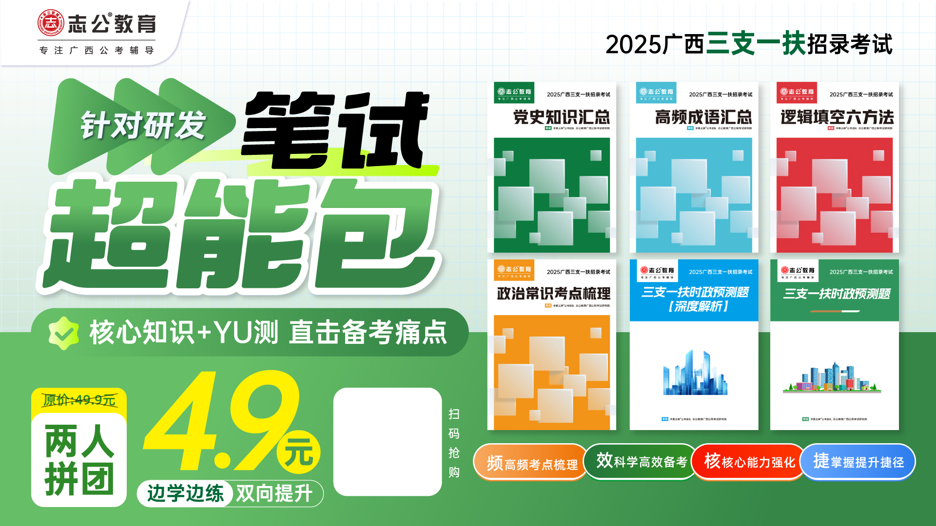 為助力青年群體高效備考,小志基于廣西地區(qū)歷年考試真題和考情分析,針對(duì)廣西地區(qū)“三支一扶”考試特點(diǎn),精準(zhǔn)把握命題趨勢(shì)。內(nèi)容緊扣考試大綱,覆蓋綜合知識(shí)、公共基礎(chǔ)知識(shí)及崗位相關(guān)實(shí)務(wù),幫助考生高效掌握核心考點(diǎn),為考生提供系統(tǒng)化、精準(zhǔn)化的備考支持。