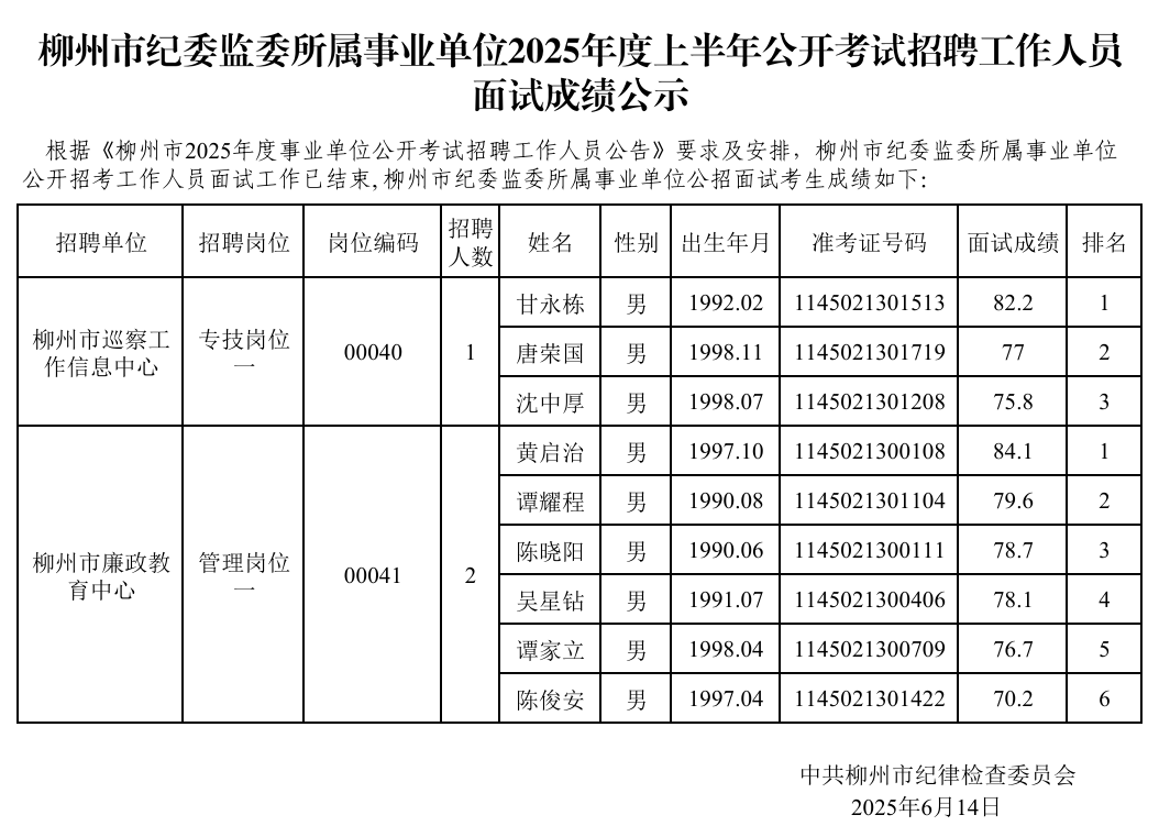 原文標(biāo)題:柳州市紀(jì)委監(jiān)委所屬事業(yè)單位2025年度上半年公開(kāi)考試招聘工作人員面試成績(jī)公示