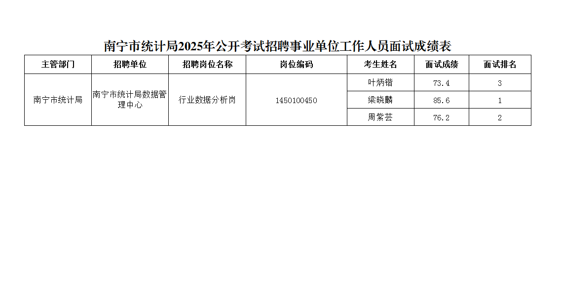 原文標(biāo)題:南寧市統(tǒng)計(jì)局2025年公開(kāi)考試招聘事業(yè)單位工作人員面試成績(jī)表