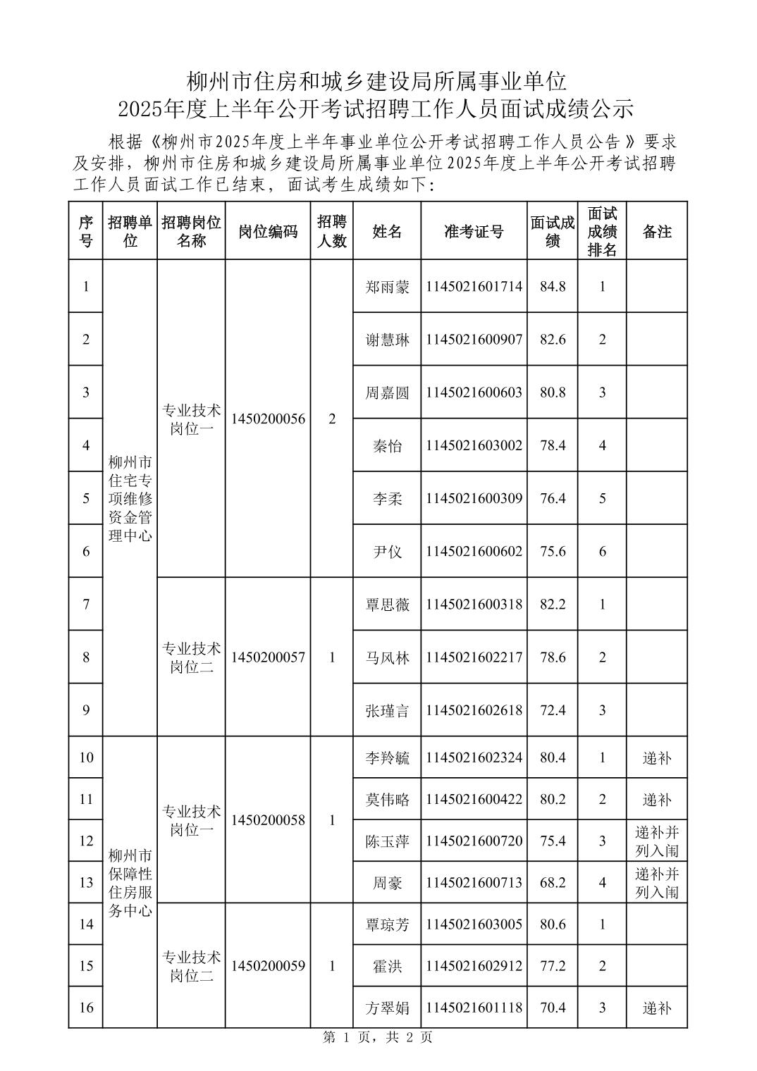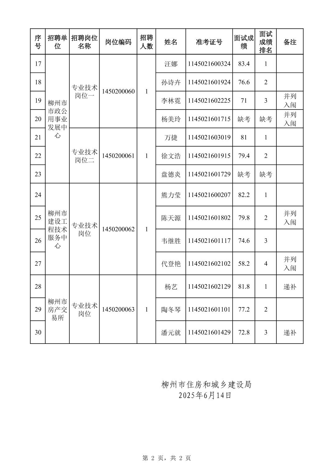 柳州市住房和城鄉(xiāng)建設(shè)局所屬事業(yè)單位2025年度上半年公開(kāi)考試招聘工作人員面試成績(jī)公示