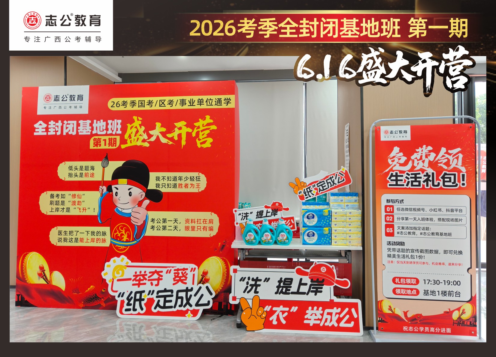 今天的開班還有一系列小活動(dòng)噢~瞧!——“學(xué)員打卡活動(dòng)”,所有今天到場(chǎng)的基地班學(xué)員,通過做一些小任務(wù)的方式,可以到前臺(tái)領(lǐng)取生活禮包即可領(lǐng)取生活禮品1份(一提六包的紙巾,或者一瓶洗衣液),這也是志公教育對(duì)所有學(xué)員的美好祝愿,預(yù)祝大家未來能夠“紙”定成公,“洗”提上/岸,“衣舉成公”!