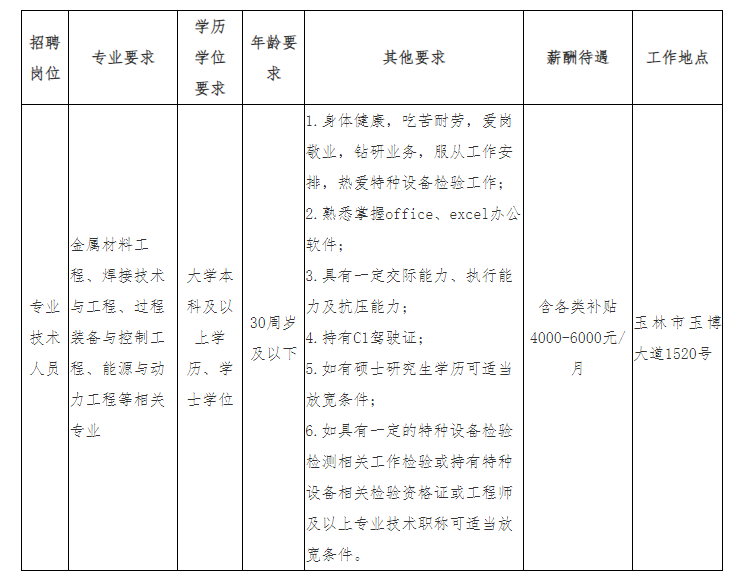 廣西壯族自治區(qū)特種設(shè)備檢驗研究院玉林分院為廣西壯族自治區(qū)特種設(shè)備檢驗研究院下屬分支機(jī)構(gòu),根據(jù)業(yè)務(wù)發(fā)展需要,現(xiàn)面向社會公開招聘編外聘用人員1名,崗位需求如下: