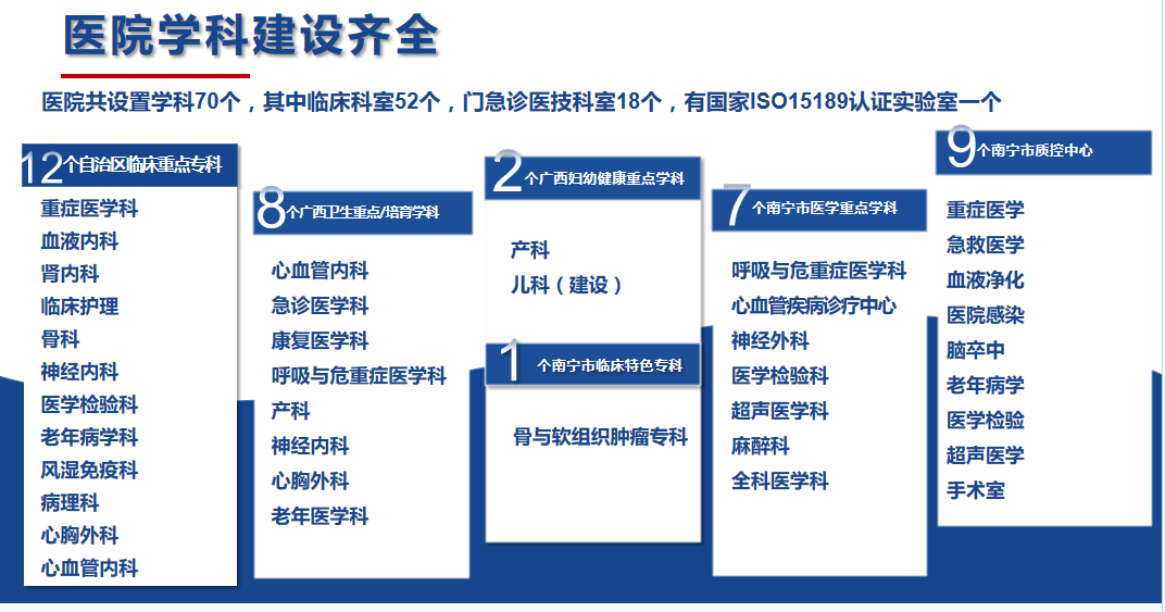 南寧市第一人民醫(yī)院(南寧市兒童先天性心血管疾病研究所、南寧市呼吸道疾病研究所、廣西醫(yī)科大學(xué)第五臨床醫(yī)學(xué)院、廣西醫(yī)科大學(xué)第五附屬醫(yī)院)始建于1914年,是一家擁有百年歷史的國(guó)家三級(jí)甲等綜合性醫(yī)院。醫(yī)院設(shè)有52個(gè)臨床病區(qū),18個(gè)門(mén)診醫(yī)技科室,總開(kāi)放床位1912張(含分院)。醫(yī)院是國(guó)家高級(jí)認(rèn)知中心建設(shè)單位及國(guó)家神經(jīng)介入建設(shè)中心、國(guó)家ISO15189醫(yī)學(xué)檢驗(yàn)認(rèn)證機(jī)構(gòu),國(guó)家聯(lián)盟中心認(rèn)證的胸痛中心、卒中中心;擁有廣西臨床重點(diǎn)專(zhuān)科(含培育)12個(gè)、自治區(qū)醫(yī)療衛(wèi)生重點(diǎn)學(xué)科(含培育)8個(gè)、自治區(qū)婦幼健康服務(wù)重點(diǎn)學(xué)科(含建設(shè))2個(gè)、南寧市醫(yī)學(xué)重點(diǎn)學(xué)科7個(gè)、南寧市臨床特色優(yōu)勢(shì)專(zhuān)科1個(gè),南寧市質(zhì)控中心9個(gè)。醫(yī)院是國(guó)家衛(wèi)健委創(chuàng)面修復(fù)能力建設(shè)和繼續(xù)教育中心教學(xué)基地、國(guó)家級(jí)住院醫(yī)師規(guī)范化培訓(xùn)培訓(xùn)基地,廣西醫(yī)科大學(xué)碩士研究生培養(yǎng)基地,同時(shí)是暨南大學(xué)共建醫(yī)學(xué)教育基地、第十批廣西博士后創(chuàng)新實(shí)踐基地;醫(yī)院還具備國(guó)家藥物臨床試驗(yàn)機(jī)構(gòu)資質(zhì)(含I期研究室);醫(yī)院醫(yī)學(xué)實(shí)驗(yàn)中心獲批廣西科技廳重點(diǎn)實(shí)驗(yàn)室“廣西智慧精準(zhǔn)醫(yī)學(xué)實(shí)驗(yàn)室”,是南寧市衛(wèi)健系統(tǒng)唯一的省級(jí)重點(diǎn)建設(shè)實(shí)驗(yàn)室。2019年在市委市政府支持下,成立南寧市第一人民醫(yī)院醫(yī)療集團(tuán)。現(xiàn)有27家成員單位,形成“1+4+22”(中心醫(yī)院+4家二級(jí)醫(yī)院+22家基層衛(wèi)生及養(yǎng)老機(jī)構(gòu))一體化格局,推行“三二一”運(yùn)營(yíng)管理模式,逐步構(gòu)建全生命周期健康管理鏈。