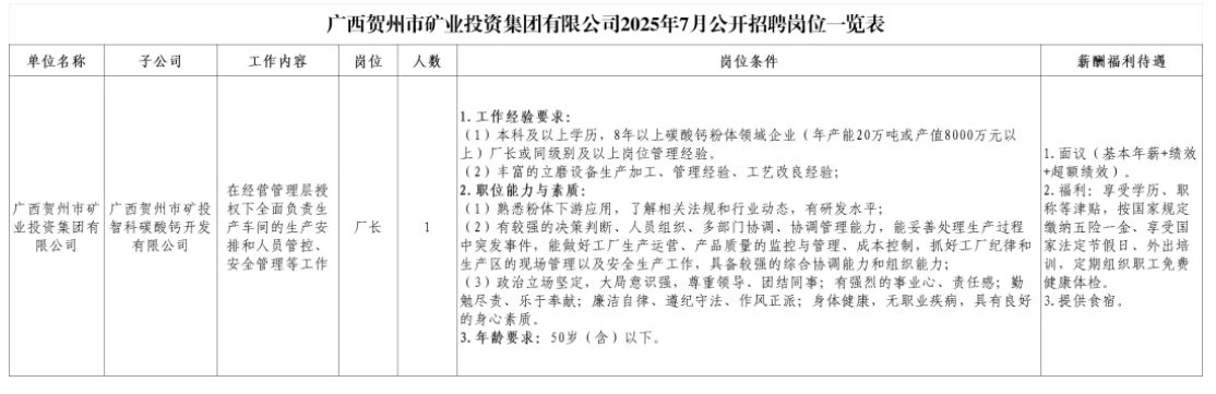 具體內(nèi)容詳見附件1《廣西賀州市礦業(yè)投資集團(tuán)有限公司2025年7月公開招聘崗位一覽表》