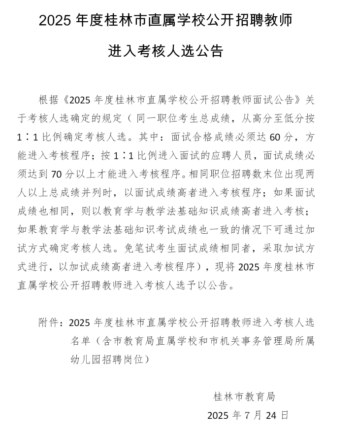 2025年度桂林市直屬學(xué)校公開招聘教師進入考核人選公告
