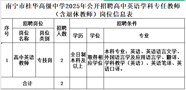 3.網上報名。應聘者需規(guī)范填寫《南寧市桂華高級中學公開招聘專任教師報名表》(見附件2),將個人應聘證明材料一并打包(學科+姓名+聯系電話)發(fā)送到nnsghgjzx2022@163.com郵箱。