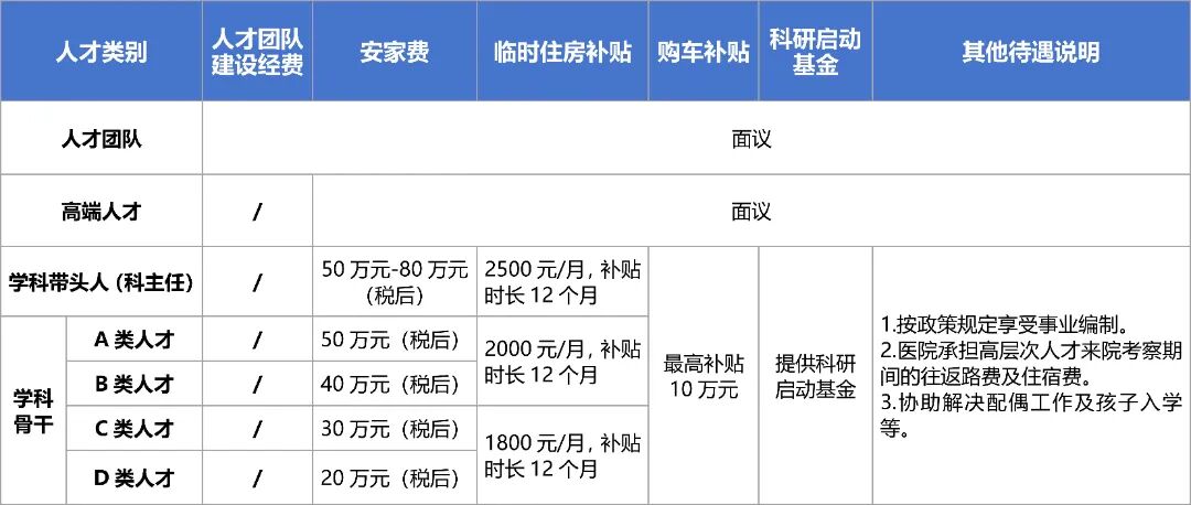 聘用為急需緊缺專業(yè)崗位醫(yī)師(緊缺專業(yè)包括:重癥醫(yī)學(xué)科、麻醉科、感染性疾病科、兒科、急診醫(yī)學(xué)科、病理科、精神科、產(chǎn)科、神經(jīng)外科、超聲科)的碩士研究生或符合“雙一流”建設(shè)高校及“雙一流”建設(shè)學(xué)科碩士研究生,給予5-10萬安家費。