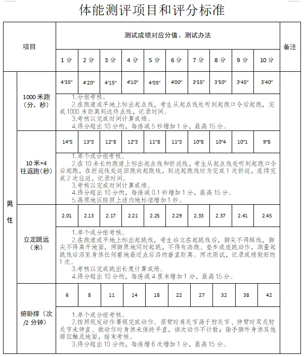 1.體能測評(60%):體能測試內(nèi)容為四個項目,1000米跑(分、秒)、俯臥撐(次/2分鐘)、10米*4往返跑(秒)、立定跳遠(yuǎn)(米)。報考人員須自帶運(yùn)動服、運(yùn)動鞋完成體能測試。
