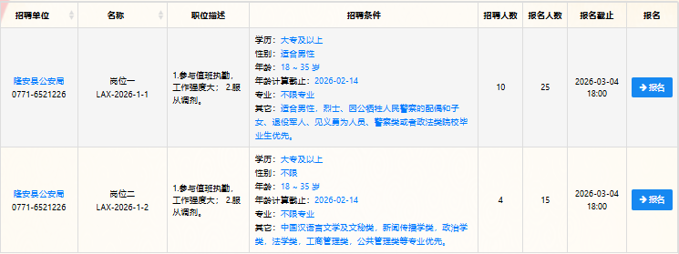 本次公開招聘輔警14人,主要安排在隆安縣公安局各警種、各部門、各派出所,詳見《隆安縣公安局2026年度公開招聘警務(wù)輔助人員職位計(jì)劃表》(附件1)。