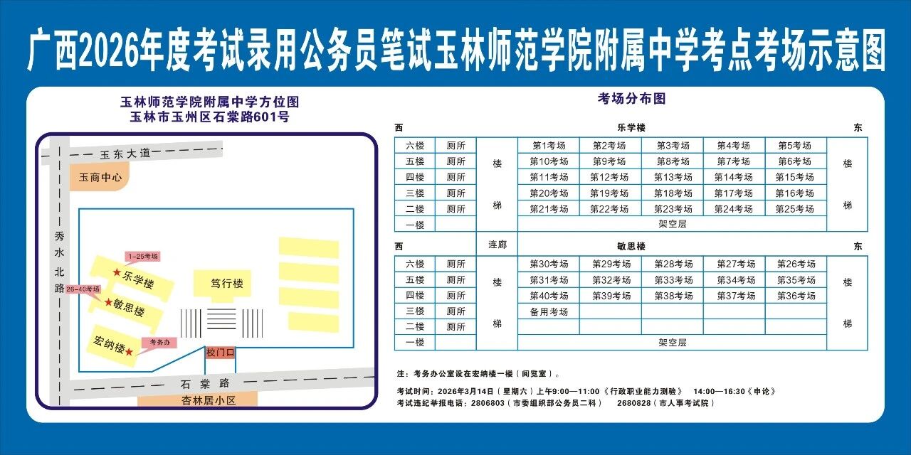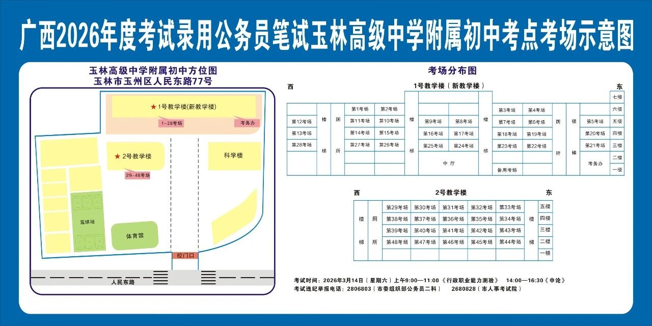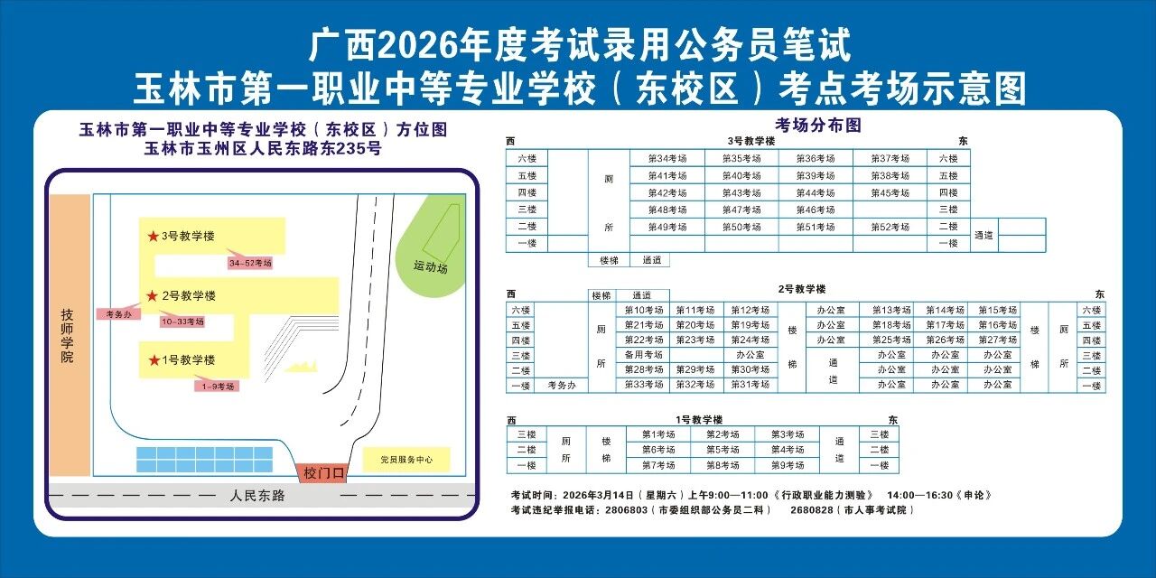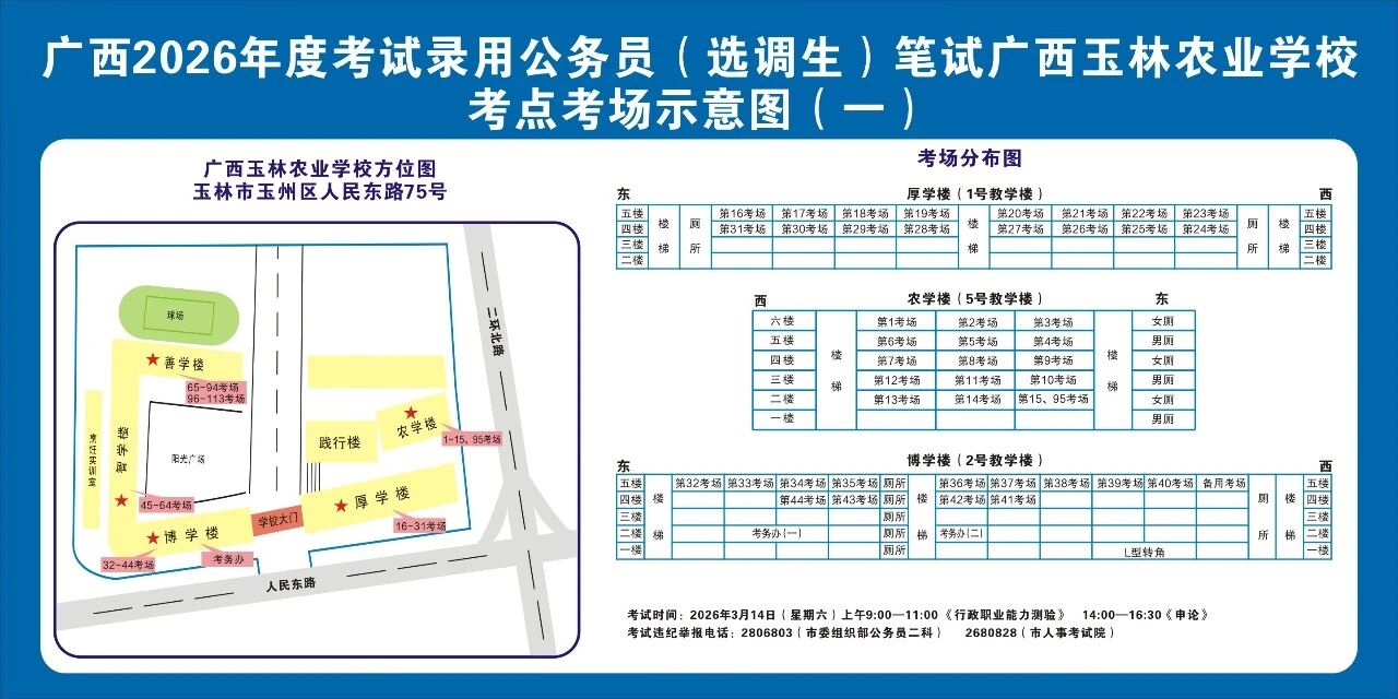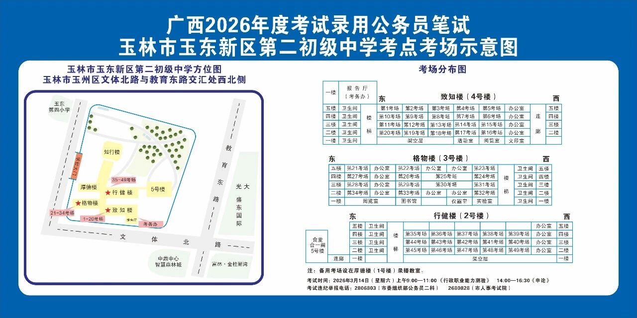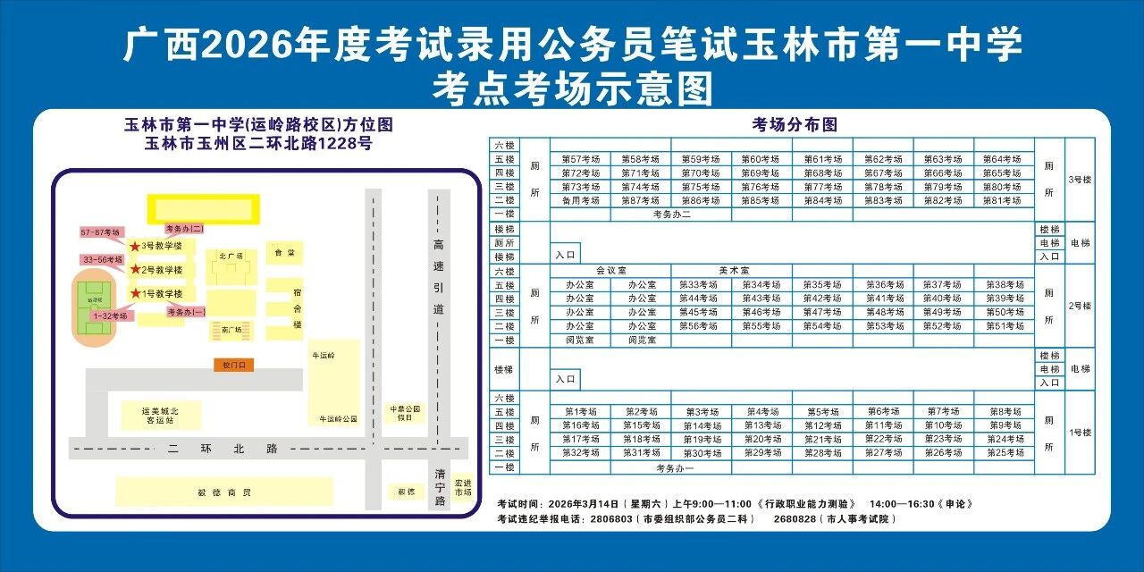 除考試當(dāng)天考生可以進(jìn)入考點外,考生不得提前進(jìn)入考點查看考場(學(xué)校將在大門處擺放考場分布示意圖),玉林考區(qū)10個考點的考場布置情況如下: