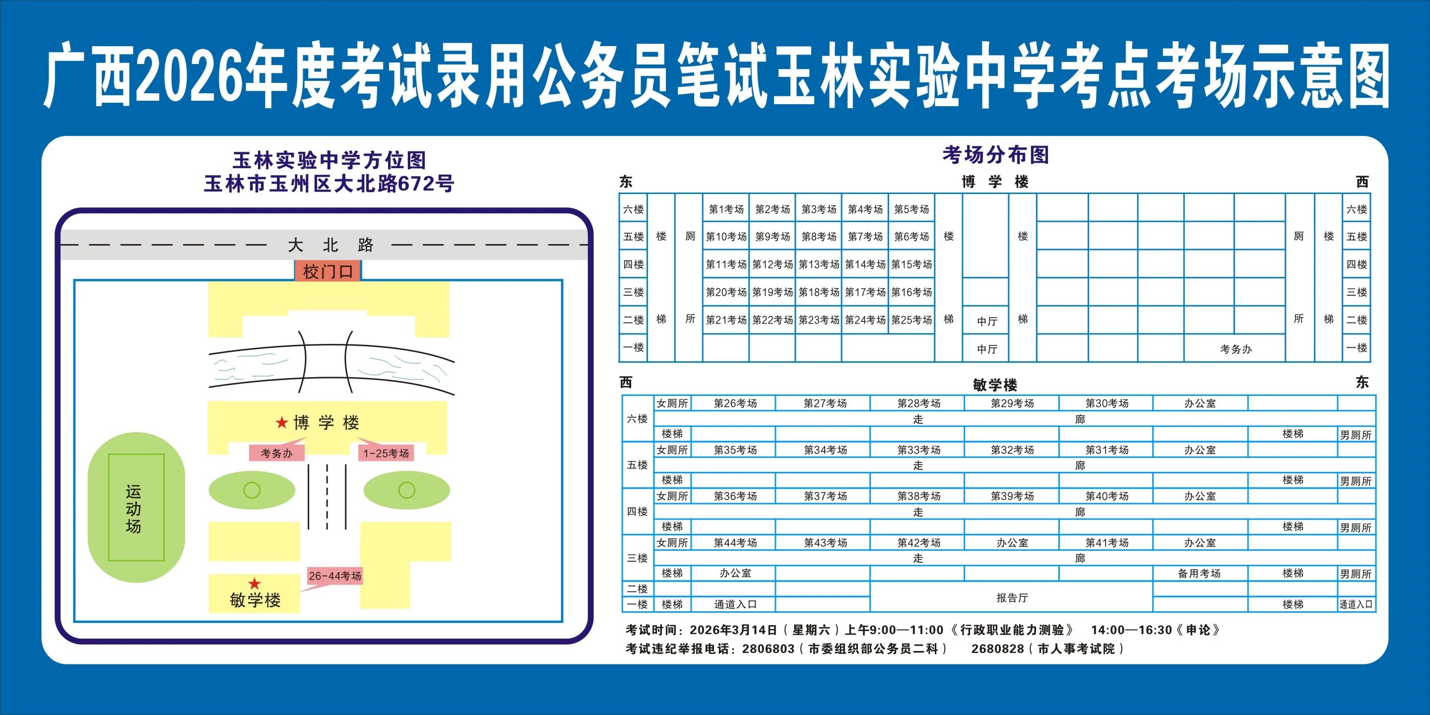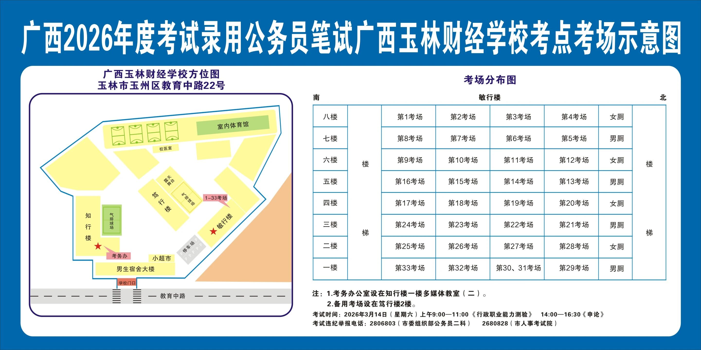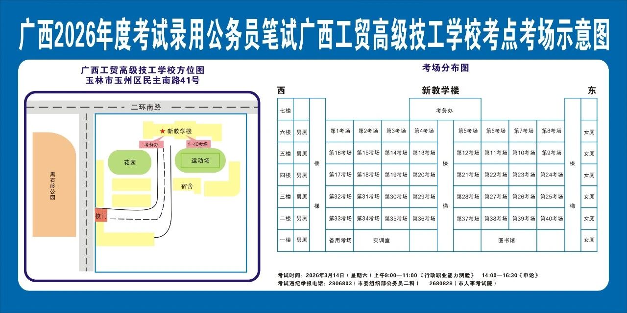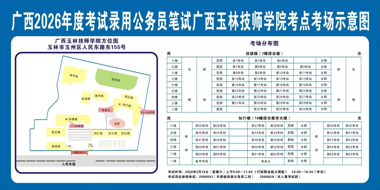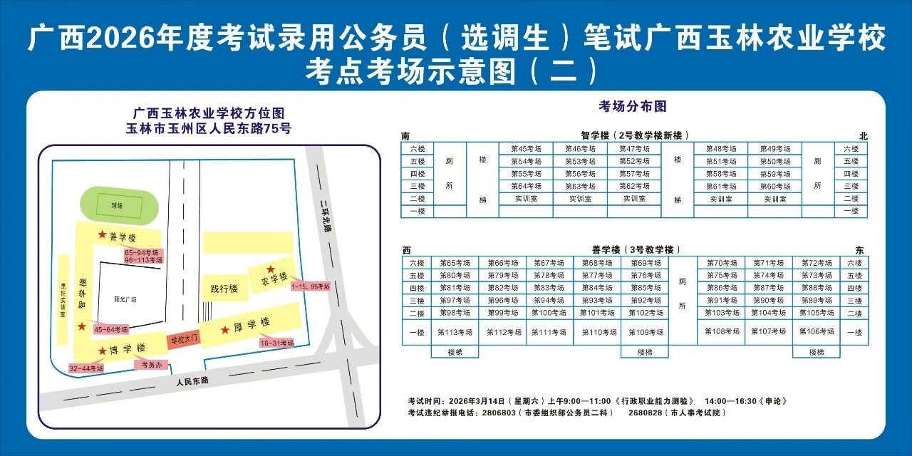 除考試當(dāng)天考生可以進(jìn)入考點外,考生不得提前進(jìn)入考點查看考場(學(xué)校將在大門處擺放考場分布示意圖),玉林考區(qū)10個考點的考場布置情況如下: